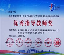 2019年5月,第十五届“挑战杯”广东大学生课外学术科技作品竞赛决赛在佛山举行,我院教师陈昕副教授指导的学生参赛项目《基于归因理论的大学生责任意识影响机制实证研究—大学生责任意识的维度结构及其差异分析》荣获特等奖,陈昕老师荣获优秀指导教师奖。