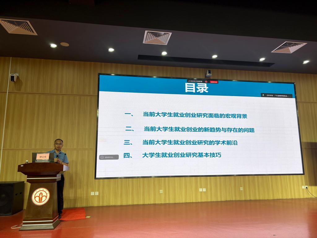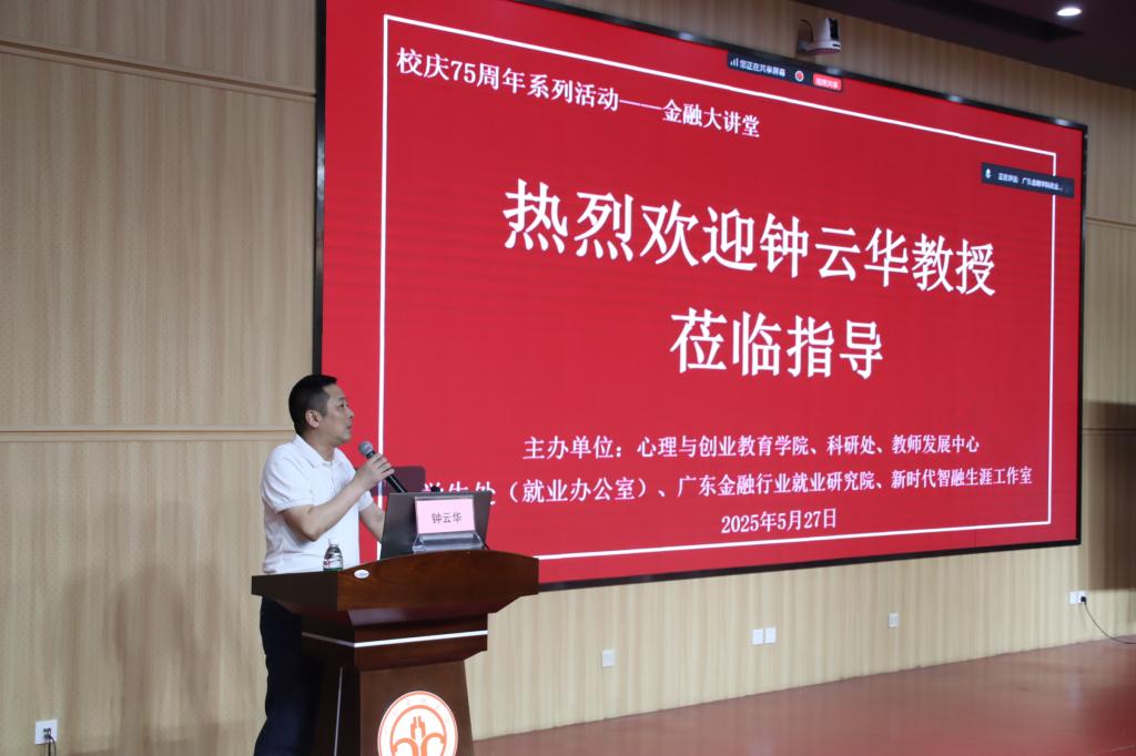 2025年5月27日,作为庆祝建校75周年系列活动的学术活动,由在线一区二区、科研处、教师发展中心、学生处、广东金融行业就业研究院、新时代智融生涯工作室联合主办的“金融大讲堂”暨第五十七期学工论坛在北阶103成功举行。本次讲座特邀湖南师范大学教育科学学院钟云华教授作题为《大学生就业创业研究:学术前沿与研究技巧》的专题报告。科研处处长杨公齐、学生处处长容志豪、副处长林丽等出席活动,广东金融行业就业研究院副院长杨永贵、在线一区二区师生、广州校区辅导员等一同参与,在线一区二区副院长陈昕主持讲座。