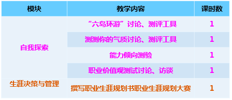 每一章的内容依托教材的理论知识,,设计成教学模块,利用专题的形式在课堂上进行讲授。课堂外通过实践项目的实施、职业测评、职业咨询、以及开展职业生涯规划大赛等手段,让学生开展自己的职业生涯规划活动,寻求理论与实践完美结合的最佳途径。