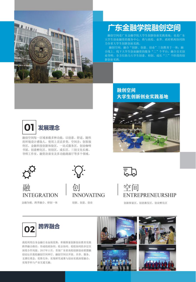 融创空间是我校贯彻落实国家双创政策的重要举措,以全面深化创新创业教育改革,激发大学生创新创业热情。融创空间位于学校北苑四楼,建筑面积1200平方米,2017年9月投入使用。